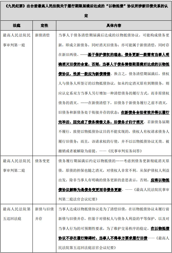 针对债务履行期限届满后达成的“以物抵债"协议,最高人民法院不同法庭在该问题上的认识略有不同,有的法庭认为可能构成债务更新,即成立新债务,同时消灭旧债务;亦可能属于新债清偿,同时存在新旧两债;有的法庭未明确说明新债如何履行,笼统定义为债务变更;还有的法庭明确了新旧债的履行顺序,说明债权人应当先要求履行新债,在履行新债不存在障碍时不得单方面要求履行旧债,具体情况整理如下: