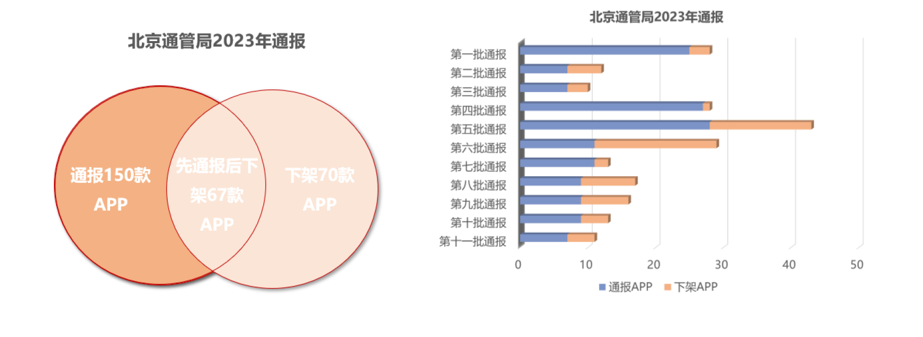 从北京通管局对外公开发布的信息来看,北京通管局在2023年共计通报11批次存在侵害用户权益行为的APP,累计通报150款APP、下架70款APP。其中,被通报后并未按照要求完成整改,从而被下架的APP多达67款。
