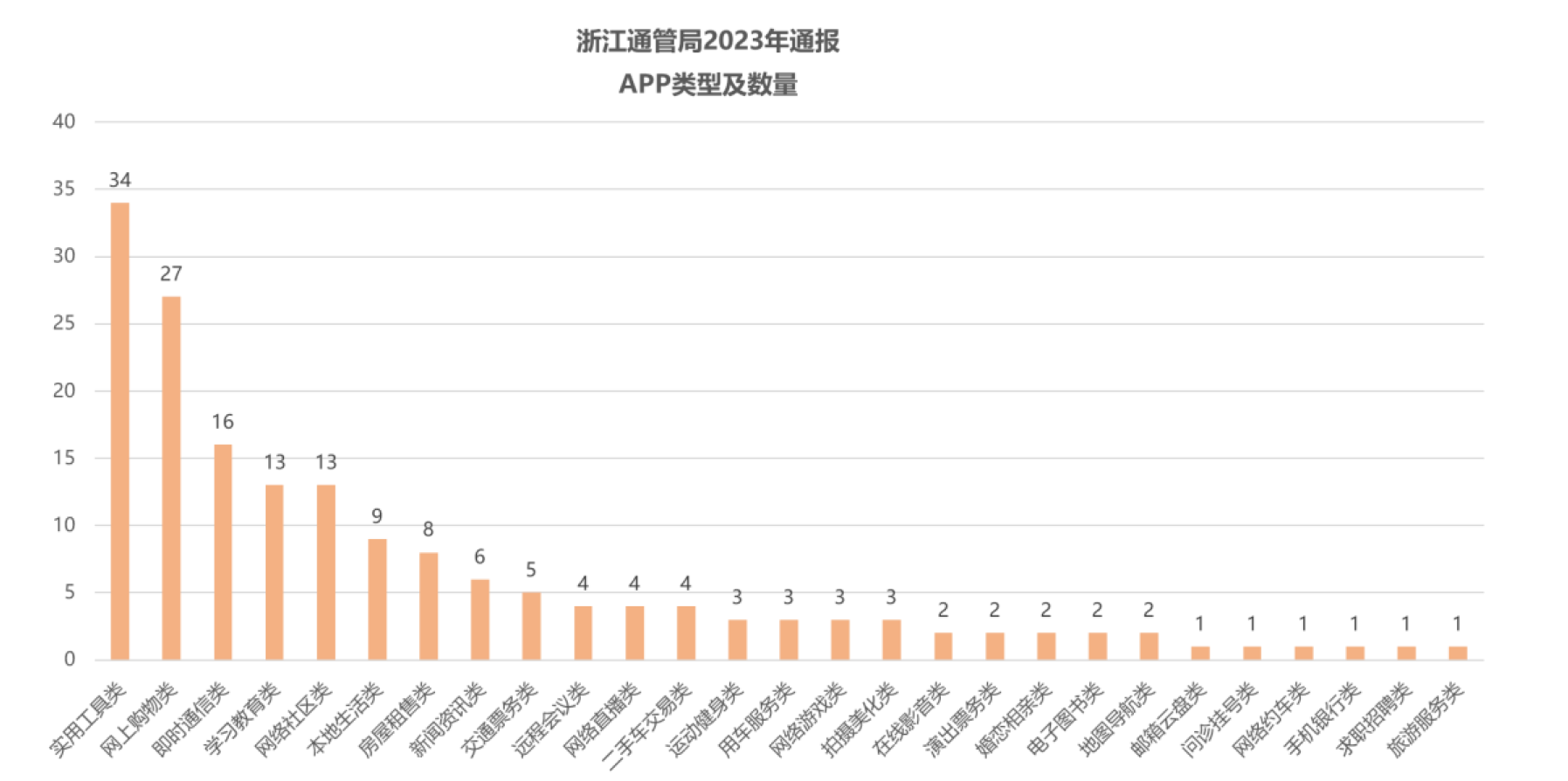 在2023年,浙江通管局通报了27类常见APP的违规行为,其中: