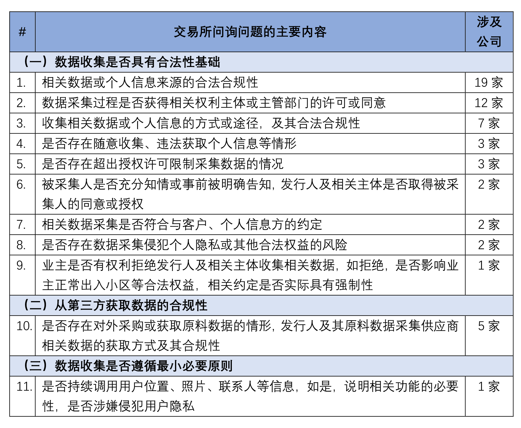 根据上述82家企业的问询函等公开披露文件,除上述数据收集、使用、存储环节问询的主要问题外,交易所也可能就数据处理情形、数据权属等问题向相关企业进行概括性地问询,具体如下:
