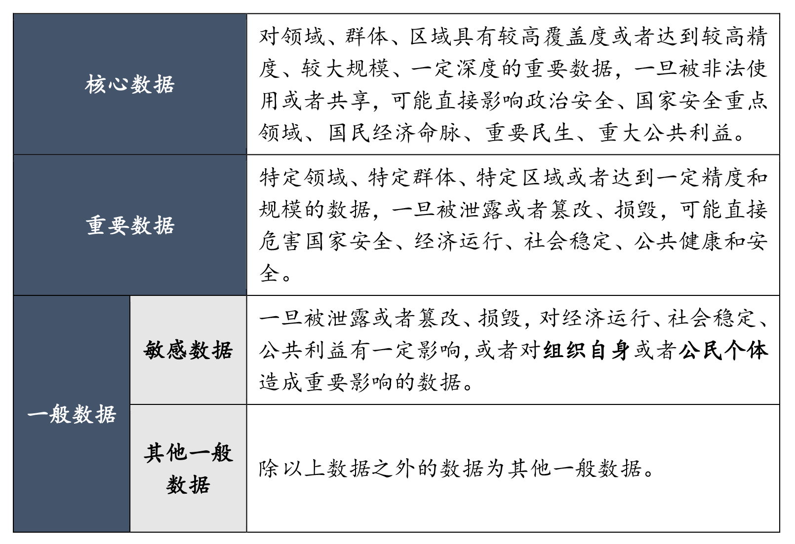 • 对于数据分级而言,《征求意见稿》衔接《数据安全法》的通用要求,将数据分按照重要性和敏感程度,从高到低分为核心数据、重要数据、一般数据三大级别。特别地,《征求意见稿》还将一般数据细分为“敏感数据"和“其他一般数据"。这一“大三级、小四级"的分级标准是《征求意见稿》中的创新性要求,与《人行领域数安办法(征求意见稿)》中的“三级五层、可用性"以及行业标准《金融数据安全 数据安全分级指南》(JR/T 0197-2020)(“0197标准")的分级要求均有所差异。