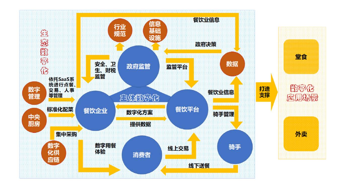 如上图所示,餐饮数字化包含数字供应链、扫码点餐、移动支付、在线外卖、在线点评、中央厨房等多个应用场景,其中堂食和外卖是最主要的两大应用场景。除此之外,餐饮数字化由餐饮企业、餐饮平台、消费者、骑手、供应商和政府监管等多方主体参与。
