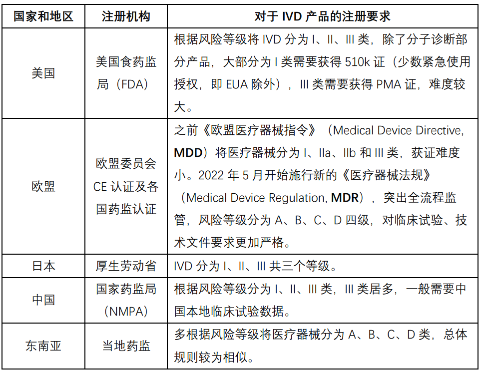 欧盟、美国等成熟市场已经制定了较为完善的IVD产品注册标准。近十年来,东南亚国家也开始逐步建立相关市场准入标准,针对IVD产品的监管经历了从宽松到严格的过程,相关审查参考CE、FDA的认证标准。整体来说,东南亚对于IVD产品的注册要求更为宽松,一般不需要对生产厂家进行现场审核,各国对于IVD产品的注册均有特定的规定,具体如下: