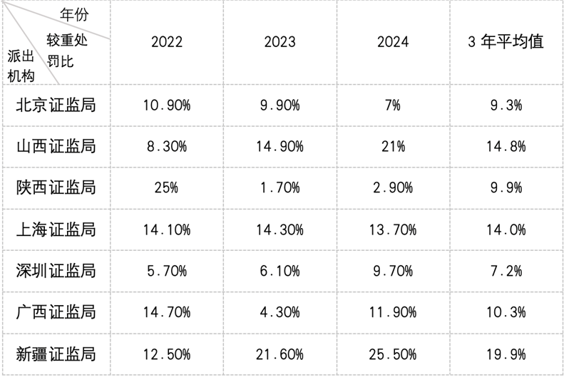 我们分析了7个省、自治区、直辖市的证监会派出机构近三年做出的罚款、市场禁入类处罚占全部处罚和措施的比重(以下简称“较重处罚比”),结果如下: