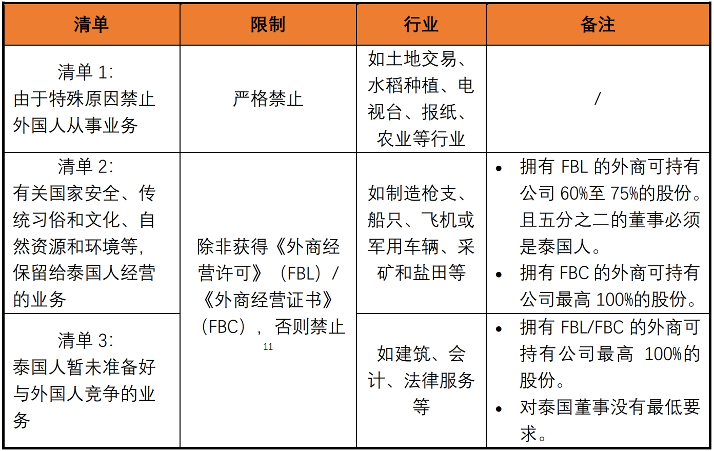 泰国对外商投资企业的市场准入实行负面清单制度。FBA以附件形式将限制外国人投资的行业分列于三个清单,其中涵盖40余个限制行业,具体如下: