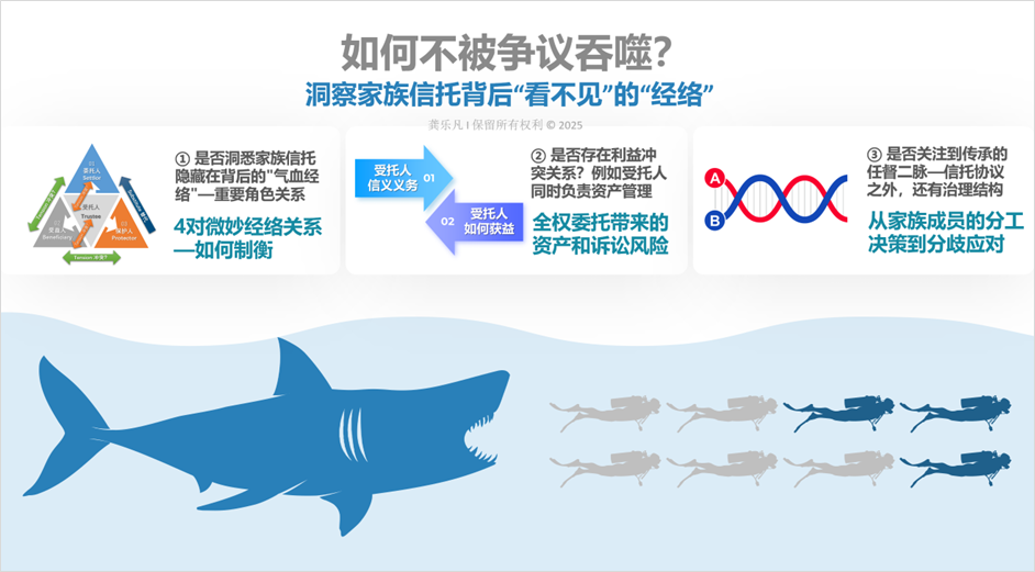 如果不全面了解上述的隐性问题,信托协议看似再“完美”,企业家及其家人分别作为“委托人”和“受益人”的权益,在未来的某天很可能会被“争议”这头“鲨鱼”所吞噬。