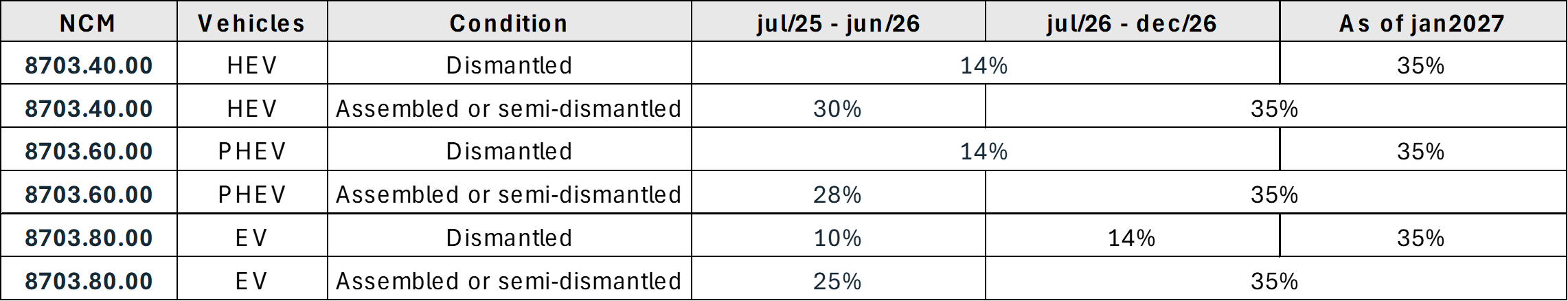 巴西曾临时下调35%的标准进口关税,以鼓励混动(HEV)、插混(PHEV)和纯电(BEV)车型进口,助力减排目标。但在本地车企的施压下,低税率适用期被缩短。从2025年7月至2026年6月、2026年7月至12月及2027年1月起,不同类型车辆的散件、组装或半散件进口税率逐步调整,2027年1月起多数车型将恢复35%的标准税率。根据现行制度,进口税率应根据车辆进口时的具体状态确定。这些措施旨在抑制整车进口,以推动2026年本地组装生产。