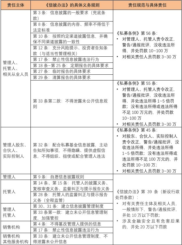 根据信息披露违法情节、后果的不同,监管机关可分别施以行政监管措施或者行政处罚。关于行政处罚的情形,一方面,《信披办法》将大部分信息披露违法行为的行政责任条款链接至《私募投资基金监督管理条例》(以下简称《私募条例》);另一方面,《信披办法》第39条创设了新的私募基金信息披露违法行政处罚情形,主要包括自愿信息披露、托管人新的复核与监督上报职责、销售机构职责、未公开信息保密等事项。现将违法主体、违法行为及其行政责任规则等总结如下表: