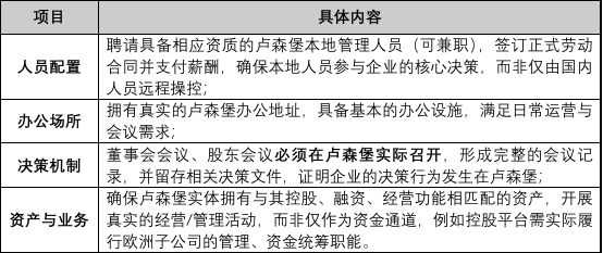 经济实质是卢森堡及欧盟监管的核心要求[18],也是中企享受税收优惠、适用税收协定的基石,无论设立何种法律载体,均需配置与企业功能相匹配的人员、办公场所、决策机制,这是满足“受益所有人”测试和“主要目的测试”的核心: