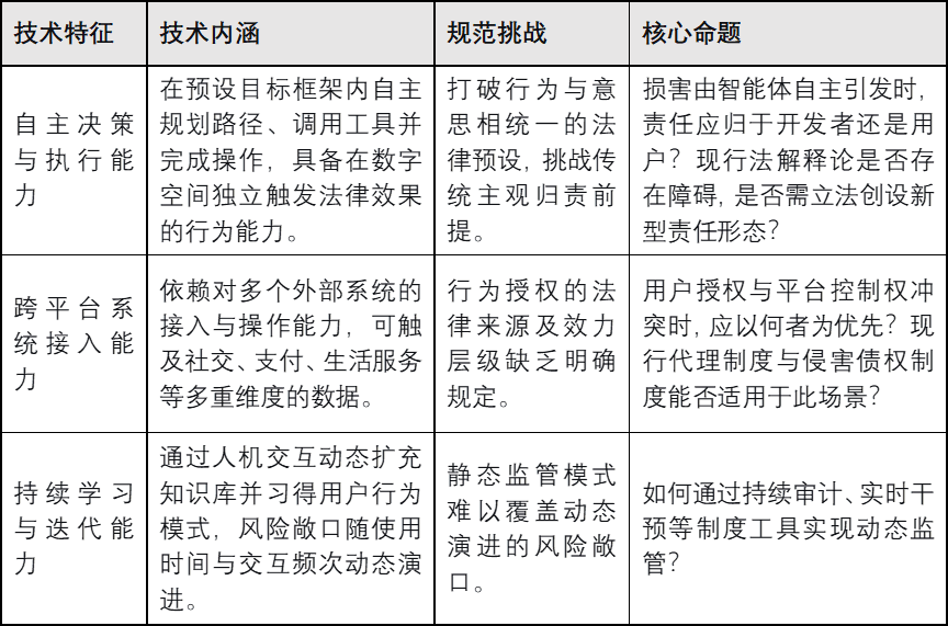AI Agent区别于传统大语言模型的本质特征,在于其实现了从信息处理到行为执行的职能跨越。2025年被业界称为AI Agent元年[7],国务院同年印发的《关于深入实施“人工智能+”行动的意见》[8]重点将智能体正式纳入国家级政策文件。这一跨越使人工智能的法律风险从内容安全延伸至行为安全,进而对以自然人行为为核心构建的传统法律责任体系形成结构性挑战。与传统大语言模型相比,AI Agent的核心技术特征主要体现在三个维度:一是自主决策能力,这一特征对传统归责逻辑形成直接冲击;二是跨平台接入能力,这一特征使既有授权规则的适用边界趋于模糊;三是持续学习能力,这一特征对静态监管模式构成适应性挑战。具体详见下表的分析。