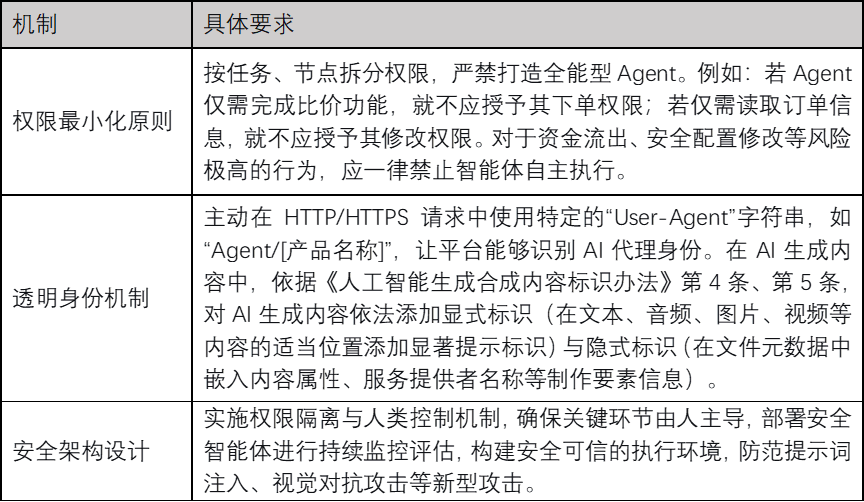 通过技术架构确保智能体行为可验证、可干预、可追溯。在权限配置层面,落实最小权限原则,按任务节点拆分权限,禁止全能型Agent,关键环节应由人主导,契合《个人信息保护法》第6条规定;在安全监控层面,部署安全智能体,实时监测异常行为并阻断;在运行环境层面,构建安全可信执行环境,防范提示词注入、视觉对抗攻击、数据投毒等新型攻击。