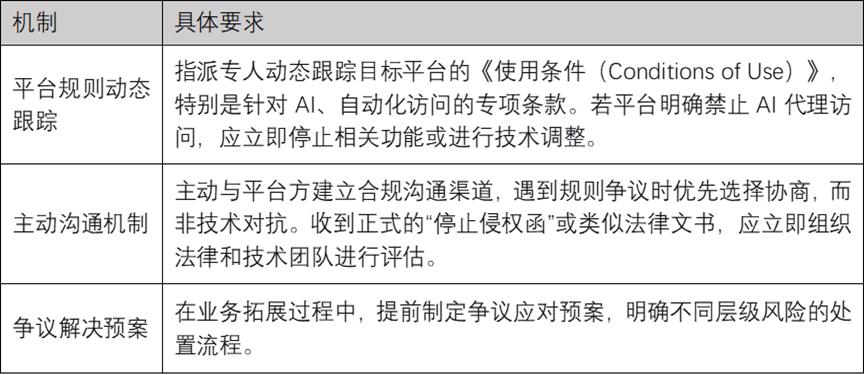 平台交互层面的合规要求,根源于AI Agent作为第三方应用与平台之间形成的法律关系。该关系的法律性质可界定为合同关系与竞争关系的复合形态,企业在此层面面临的主要风险包括违反平台服务协议所引发的违约责任,以及不当自动化访问所可能构成的不正当竞争等。具体制度安排如下表所示。