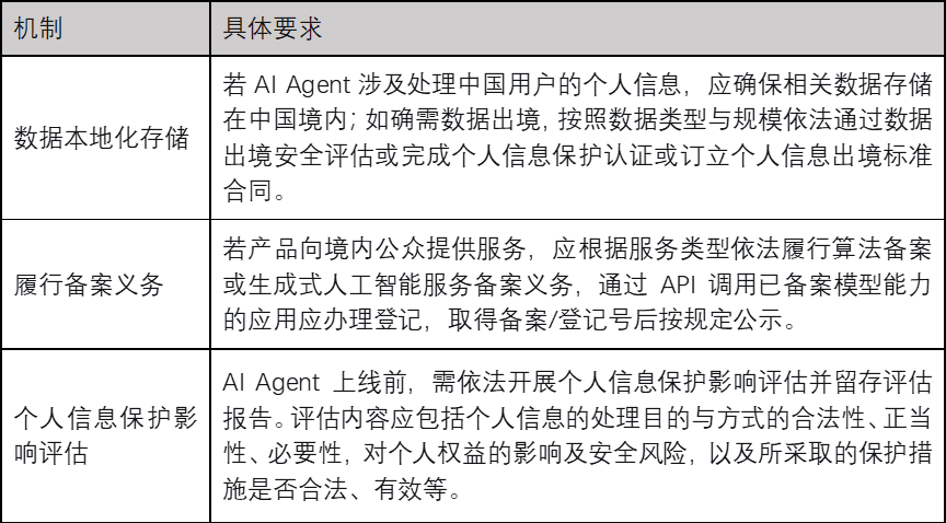 我国数据治理规范体系以《中华人民共和国网络安全法》《中华人民共和国数据安全法》《中华人民共和国个人信息保护法》为三大支柱,共同构建了涵盖数据本地化、出境安全评估、个人信息保护影响评估、算法备案的层级化义务框架。AI Agent企业在此维度面临的规范要求,具有强制性、复合性与程序性三重特征。具体制度安排如下表所示。