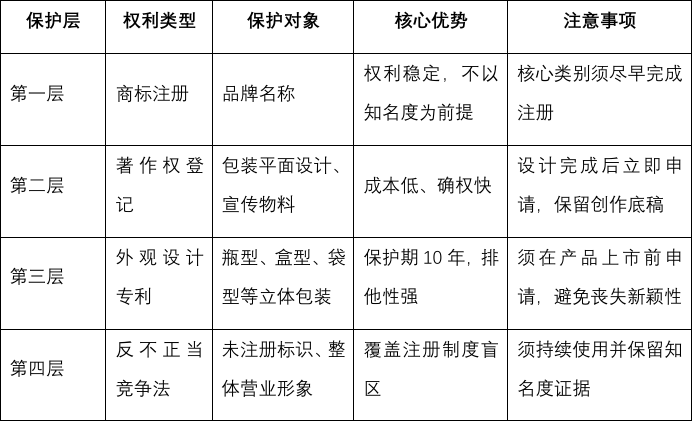 商标注册:适用于核心品牌名称、子品牌及产品线名称。商标权的优势在于权利稳定、保护力度强,且不以知名度为前置条件。建议在产品上市前即完成核心类别的商标注册。