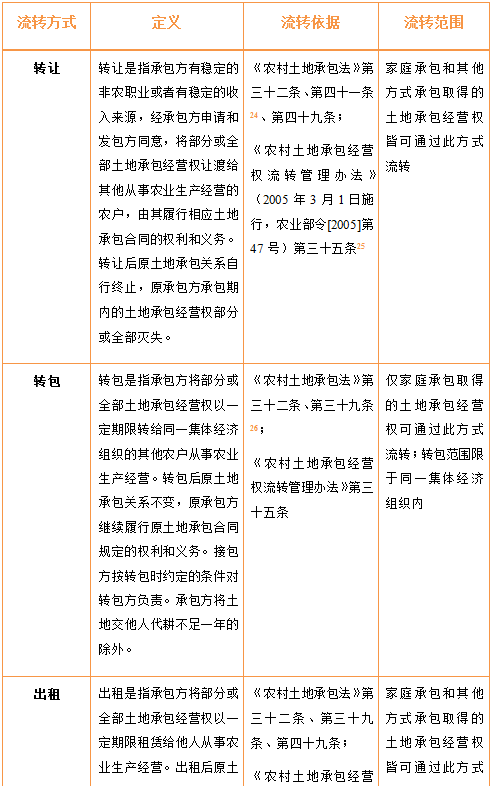 [25] 《农村土地承包经营权流转管理办法》第三十五条规定了农村土地承包经营权的转让、转包、互换、入股和出租的基本概念,其条款内容已分别摘录至本表"定义"项下。