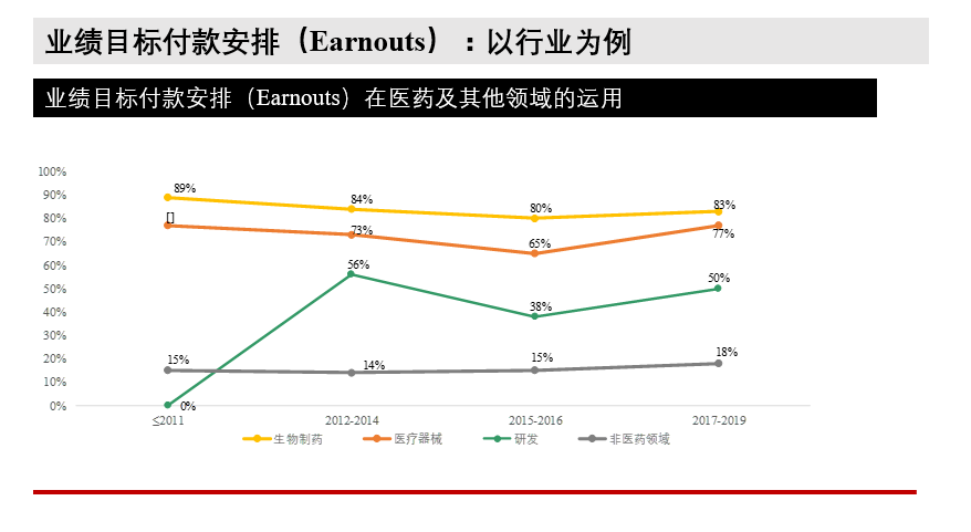 Earnouts是指由于交易双方对价值和风险的判断不一致,将传统的一次性付款方式转变成按照未来一定时期内的业绩表现进行支付的交易模式。在医药投融资及并购领域,由于药品的研发周期平均超过十年,投入超过26亿美元,还面临着"神药"可能沦为"安慰剂"的高风险的无奈情况。为此,在医药领域的并购交易中,Earnouts条款的运用非常普遍。据2011年至2019年数百个交易的统计, Earnouts条款在药品并购交易中的运用比例高于80%,在非医药领域,Earnouts条款的运用比例低于20%。