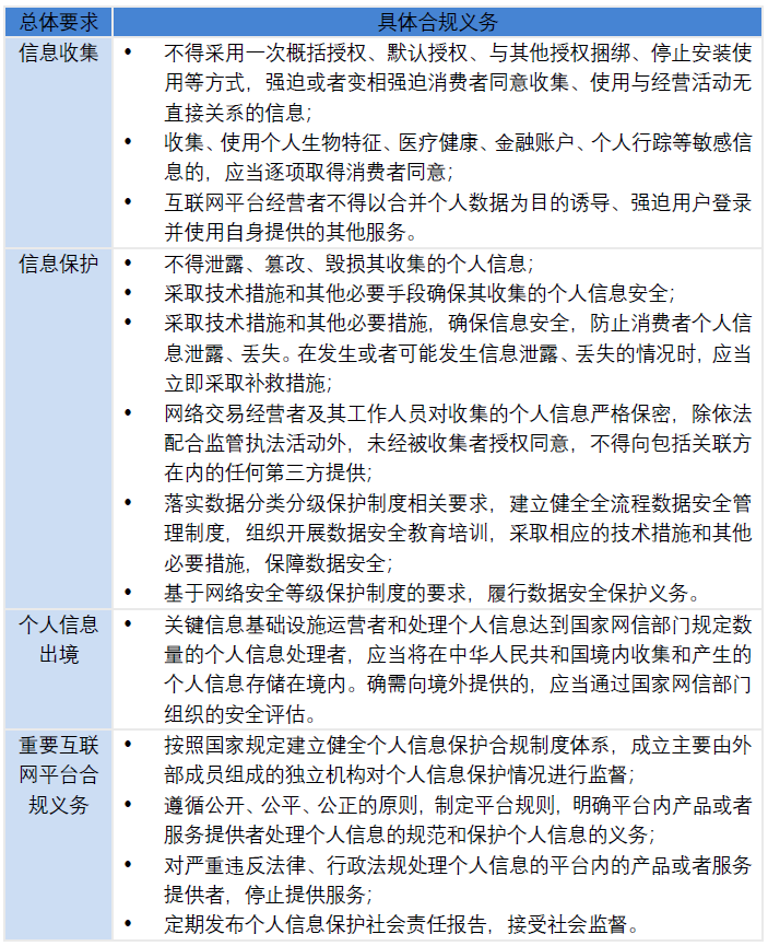 在产品质量与消费者保护合规要求方面,主要涉及的法律文件有:《消费者权益保护法》《产品质量法》《电子商务法》《网络交易监督管理办法》《侵害消费者权益行为处罚办法》等。笔者根据相关规定整理出下列主要合规要求: